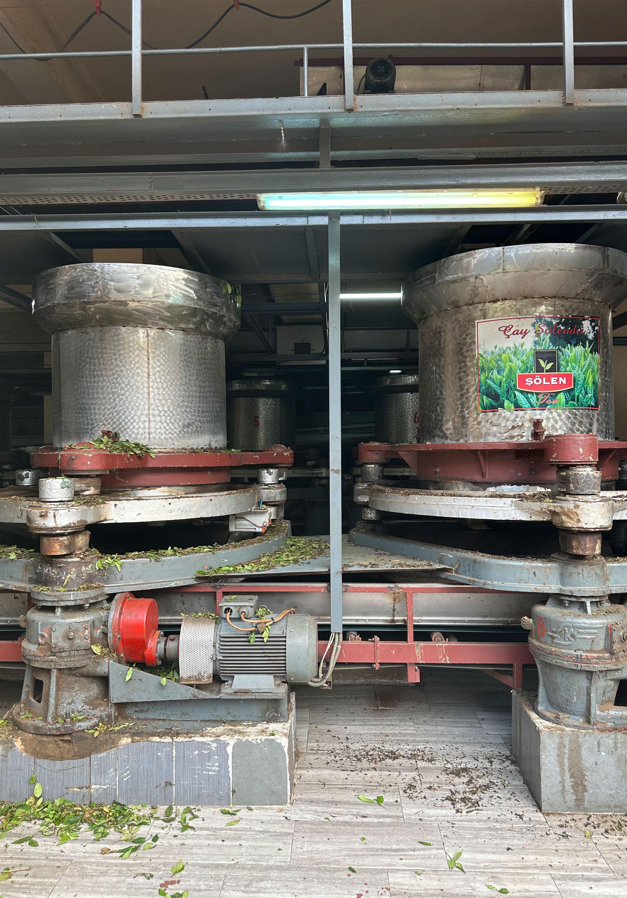 Bu anlatımın ardından fabrikayı gezintiye çıkıyoruz, yudum yudum boğazımızdan akan çay her merhalede buram buram burnumuza geliyor. Aleyna Hanım, daha önce dinlediğimiz siyah çayın serüvenini de her bir makineyi fabrikada göstererek anlatıyor: “Siyah çay beş aşamada yapılıyor. Bunlardan birincisi, öncelikle gördüğünüz bu yeşil duvarın arkasında bize gelen çaylar yaklaşık bir 10 saat işleme alınmadan önce soğdurulmaya bırakılıyor. Daha sonrasında ikinci aşama olarak büyük kazanların içerisinde daha küçük hâllere getiriliyor. Bunun ardından üçüncü aşamada 120 derece sıcaklıklarda çay 4 saat boyunca fermantasyon işlemine bırakılıyor. Bu fermantasyon işleminin sonucunda da çayımız yeşil renginden siyaha dönüyor. Ve ardından dördüncü aşama olarak bant yardımıyla büyük bacalı fırınlarımıza gidip yarım saat 120 derecede fırınlanıp kurutuluyor ve beşinci, yani son aşama olarak tozundan, çöpünden, odunundan ayrıştırılıp doğrudan paketleniyor.”