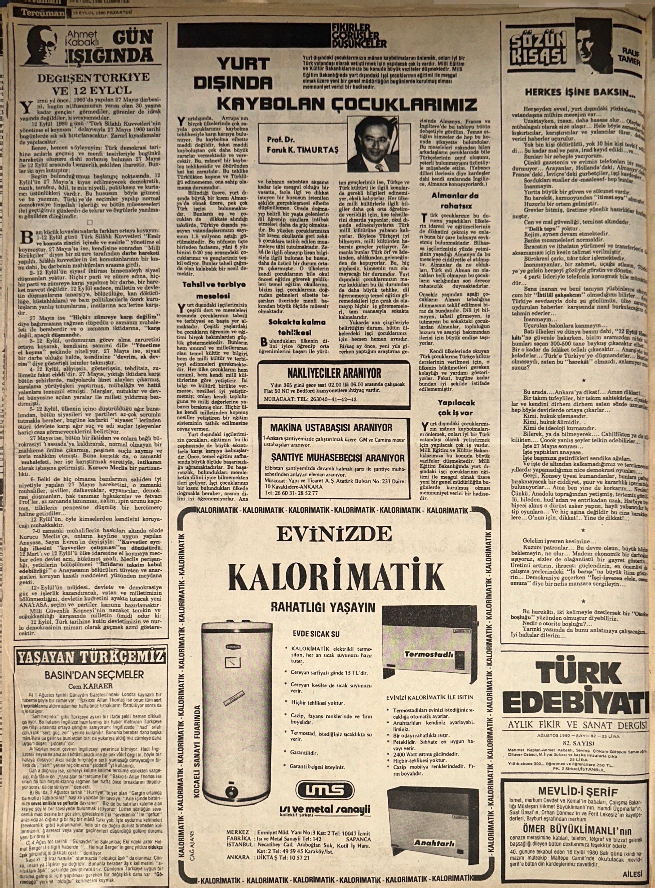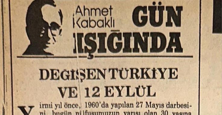 Ahmet Kabaklı, 12 Eylül 1980 Darbesi’nden birkaç gün sonra, yani 15 Eylül 1980’de Tercüman için kaleme aldığı köşe yazısında darbenin niteliğini değerlendiriyor; 27 Mayıs 1960 Darbesi ile kıyaslıyordu.