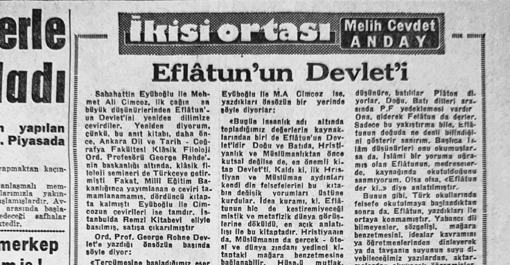 Melih Cevdet Anday, 28 Ocak 1959’da Tercüman’daki yazısında Eflâtun’un Devlet’inin Sabahattin Eyüboğlu ve Mehmet Ali Cimcoz imzasıyla eksiksiz biçimde Türkçeye kazandırılmasını, düşünce tarihimiz için bir dönüm noktası olarak selamlıyor; bu çeviriyi temel bir kaynak olarak görüyordu.