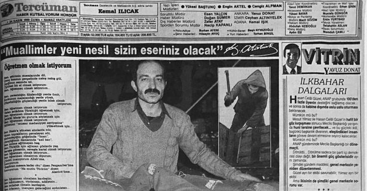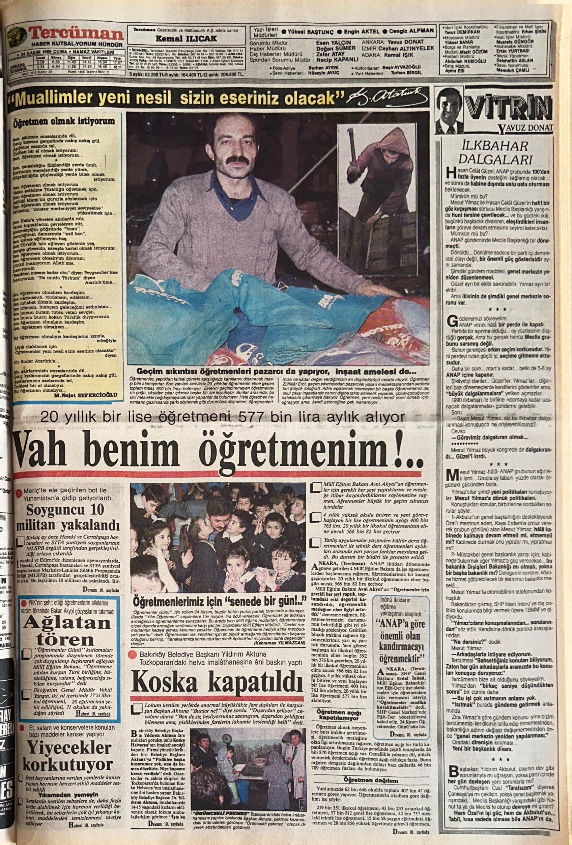 24 Kasım 1989… Her sene gibi Öğretmenler Günü kutlanıyordu fakat biraz daha fazla bir buruklukla… Ekonomik kriz, geçimi daha da zorlaştırıyor; senede bir gün kutlanan Öğretmenler Günü’nün gölgesinde ek iş yapmak zorunda kalan öğretmenler bu zorluğun altında hayatta kalmaya çalışıyorlar. Tercüman, öğretmenlerin bu mücadelesine ses olmak adına 1989 senesinde uzun soluklu bir haber yapmıştı. Gelin o habere birlikte bakalım şimdi. Tercüman Atatürk’ün “Muallimler yeni nesil sizin eseriniz olacak” cümlesiyle sayfasını açarken öte yandan o günün öğretmenlerinin hâlini gözler önüne serecek başlığını da atıyor: “Geçim sıkıntısı öğretmenleri pazarcı da yapıyor, inşaat amelesi de…” Haberin detayı şöyle: “Öğretmenler, yaptıkları kutsal görevin karşılığında karınlarını doyuracak maaşı alamıyorlar. Son yapılan zamlarla 20 yıllık bir öğretmenin eline geçen toplam maaş 600 bin lirayı bulmuyor. Evlerini geçindiremeyen öğretmenlerin çoğu, okuldan çıkar çıkmaz başla bir işe koyuluyor. Bunlar arasında bu ulvî meslekle bağdaşmayacak işler yapanlar da bulunuyor. Hele öğretmen hanımların gazinolarda şarkı söylemek gibi durumlara düşmeleri, öğretmenlerimize ne kadar değer verdiğimizin en düşündürücü cevabı oluyor. Öğretmen Zülfikar Erol, geçim sıkıntısından pazarcılık yapan meslektaşlarından sadece biri (büyük fotoğraf). Adını açıklamak istemeyen bir başka öğretmenimiz de okul çıkışı inşaatlarda canını dişine takıp amelelik yaparak, çoluk çocuğunun nafakasını çıkarmaya bakıyor. Öğretmen, yeni neslin kendi eseri olması için uğraşıyor ama kendi geleceğine pek inanamıyor…” “20 yıllık bir lise öğretmeni 577 bin lira aylık alıyor” “Vah benim öğretmenim!” Başlıklar bu elem durumu gözler önüne seren cümleler oluyor, durumu şu şekilde anlatıyor Tercüman: “Millî Eğitim Bakanı Avni Akyol’un öğretmenler için gerekli her şeyi yaptıklarını ve mesleğe itibar kazandırdıklarını söylemesine rağmen, öğretmenler büyük bir geçim sıkıntısı içindeler. 4 yıllık yüksek okulu bitiren ve yeni göreve başlayan bir lise öğretmeninin aylığı 400 bin 763 lira. 20 yıllık bir ilkokul öğretmeninin eline ancak 566 bin 82 lira geçiyor. Yanlış uygulamalar yüzünden kültür dersi öğretmenleri ile teknik ders öğretmenleri aylıkları arasında yarı yarıya farklar meydana geldi. Bu durum bir bildiri ile protesto edildi.” Detayları aynı başlıkla okurlara aktarılıyordu: “ANAP iktidarı döneminde göreve getirilen 4 Millî Eğitim Bakanı da işe öğretmenlerden başlamasına rağmen öğretmenlerimiz kıt kanaat geçiniyorlar. 20 yıllık bir ilkokul öğretmeninin eline bugün ancak 566 bin 82 lira geçiyor. Millî Eğitim Bakanı Avni Akyol’un ‘Öğretmenler için gerekli her şeyi yaptık, toplumdaki eski değerini kazandırdık, öğretmenlik mesleğine olan ilgiyi artırdık’ demesine rağmen, öğretmenlerimizin durumunun belirtildiği gibi iyi olmadığı gözleniyor. Getirilen birçok imkâna rağmen öğretmenlerimiz yarı aç yarı tok durumda. Yeni göreve başlayan bir ilkokul öğretmeninin eline bugün 392 bin 376 lira geçerken, 20 yıllık bir ilkokul öğretmeninin eline ancak 566 bin 82 lira geçiyor. 4 yıllık yüksek okulu bitiren ve yeni başlayan bir lise öğretmeni 400 bin 763 lira alırken, 20 yıllık bir lise öğretmeni 577 bin lira alabiliyor.” Öğretmen açığı kapatılamıyor: “Öğretmen olmak isteyenlere burs imkânı getirilmesi, öğretmenlik mesleğine olan ilgi artırılmasına rağmen, öğretmen açığı bir türlü kapatılamıyor. Bugün Türkiye genelinde çeşitli branşlarda 26 bin 870 öğretmen açığı var. Genellikle yabancı dil, müzik ve meslek derslerindeki öğretmen açığı oldukça fazla. Buna rağmen dengesiz dağılımdan dolayı bazı dallarda 46 bin 789 öğretmen fazlası da bulunuyor.” Öğretmen dağılımı: “Yurdumuzda 62 bin 646 okulda toplan 407 bin 47 öğretmen görev yapıyor. Öğretmenlerin okullara göre dağılımı ise şöyle: 219 bin 351 ilkokul öğretmeni, 43 bin 233 ortaokul öğretmeni, 57 bin 812 genel lise öğretmeni, 42 bin 737 mesleki teknik lise öğretmeni, 15 bin 58 yaygın eğitimdeki öğretmen ve 28 bin 856 yüksek öğretimde görevli öğretmen.” Bu bilgilerin yanında ayrıca yayımlanan M. Nejat Sefercioğlu’nun yazdığı “Öğretmen olmak istiyorum” adlı şiiri de dikkat çekiciydi. İşte şiirden küçük bir kesit: “Ben şairimin mısralarında dil/ Genç kızımın gergefinde nakış nakış gül/ Âşığımın sazında tel/ Öpülesi bir el olmak istiyorum: Ben öğretmen olmak istiyorum. “Ben çaresizliğin filizlendiği yerde ümit / Korkunun mayalandığı yerde yürek/ Güçsüzlüğün güçlendiği yerde bilek olmak istiyorum. “Ben öğretmen olmak istiyorum / Vatan evladına Türklüğü öğretmek için / Ben öğretmen olmak istiyorum / İstiklal Marşı’mı gururla söyletmek için / Ben öğretmen olmak istiyorum / Milletimi ‘muasır medeniyet seviyesine’ yükseltmek için…”
