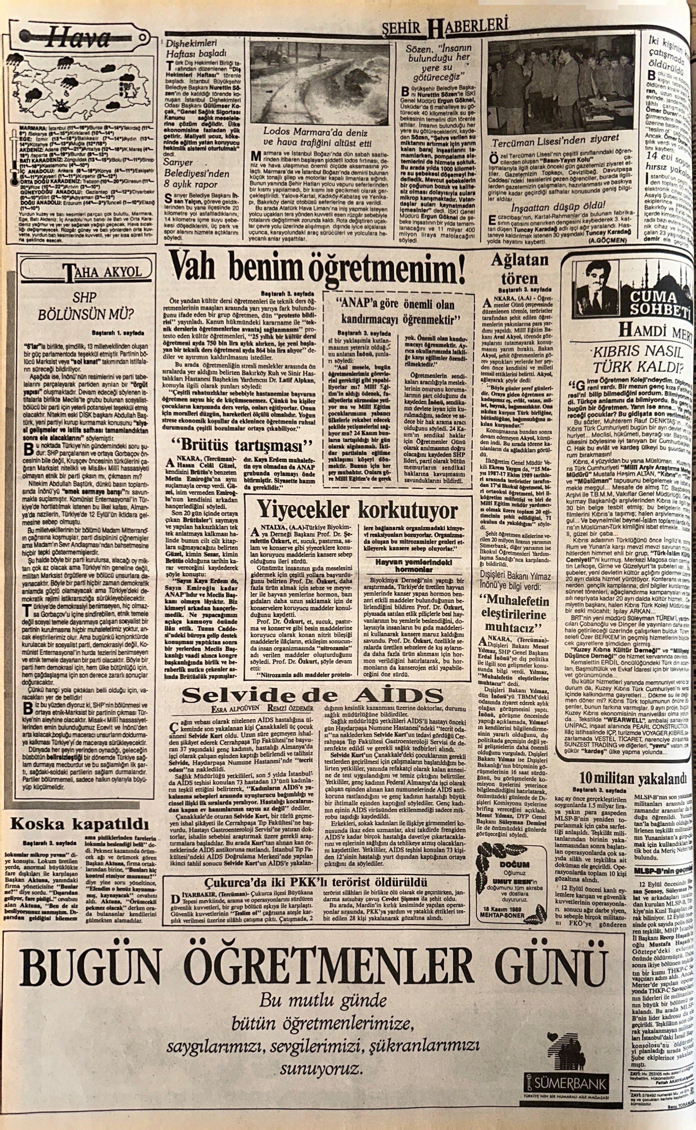 “Öte yandan kültür dersi öğretmenleri ile teknik ders öğretmenlerinin maaşları arasında yarı yarıya fark bulunduğunu ifade eden bir grup öğretmen, dün ‘protesto bildirisi’ yayınladı. Kanun hükmündeki kararname ile ‘teknik derslerin öğretmenlerine avantaj sağlanmasını’ protesto eden kültür öğretmenleri, ’25 yıllık bir kültür dersi öğretmeni ayda 750 bin lira aylık alırken, işe yeni başlayan bir teknik ders öğretmeni ayda 864 bin lira alıyor’ dediler ve ayrımın kaldırılmasını istediler. Bu arada öğretmenliğin stresli meslekler arasında ön sıralarda yer aldığını belirten Bakırköy Ruh ve Sinir Hastalıkları Hastanesi Başhekim Yardımcısı Dr. Latif Alpkan, konuyla ilgili olarak şunları söyledi: ‘Çeşitli rahatsızlıklar sebebiyle hastanemize başvuran öğretmen sayısı hiç de küçümsenemez. Çünkü bu kişiler çocukların karşısında ders verip onları eğitiyorlar. Onun için moralleri düzgün, hareketleri ölçülü olmalıdır. Yoğun strese ekonomik koşullar da eklenince öğretmenin ruhsal durumunda çeşitli bozulmalar ortaya çıkabiliyor.’” Eğitim politikalarına dair eleştiriler ise ayrıca söz konusuydu. “İnönü iktidarın yaklaşımını eleştirdi: ‘ANAP’a göre önemli olan kandırmacayı öğrenmektir.’” Haberin detayı şöyle: “SHP Genel Başkanı Erdal İnönü, Millî Eğitim Bakanlığı’nın Eğit-Der’e üye olabilmeleri için öğretmenlere izin vermesini isteyip ‘Öğretmenler sendika kurabilmelidir’ dedi SHP Genel Merkezi’nde Eğit-Der yöneticilerini kabul edip 24 Kasım Öğretmenler Günü’nün hissî bir yaklaşımla kutlanmasının yetersiz olduğunu anlatan İnönü, şunları söyledi: ‘Asıl mesele, bugün öğretmenlerimiz görevlerini gerektirdiği gibi yapabiliyorlar mı? Millî Eğitim’in aldığı ödenek, faaliyetlerin sürmesine yetiyor mu ve Millî Eğitim çocuklarımızın yabancı ülkelerle rekabet edecek şekilde yetişmelerini sağlıyor mu? 24 Kasım bunların tartışıldığı bir gün olarak algılanmalı. İktidar partisinin eğitime yaklaşımı köşeyi dönmektir. Bunun için her şey mubahtır. Onlara göre Millî Eğitim’e de gerek yok. Önemli olan kandırmacayı öğrenmektir. Ayrıca okullarımızda laikliğe karşı eğilimler özendirilmektedir.’ Öğretmenleri sendikaları aracılığıyla mesleklerinin onurunu da kaydeden İnönü, sendikanın devlete isyan için kurulmadığını, sadece ve sadece bir hak arama aracı olduğunu söyledi. 24 Kasım’ın sendikal haklar için Öğretmenler Günü olarak anılmasının doğru olacağını kaydeden SHP lideri, parti olarak bütün memurların sendikal haklarına kavuşmasını savunduklarını bildirdi.”