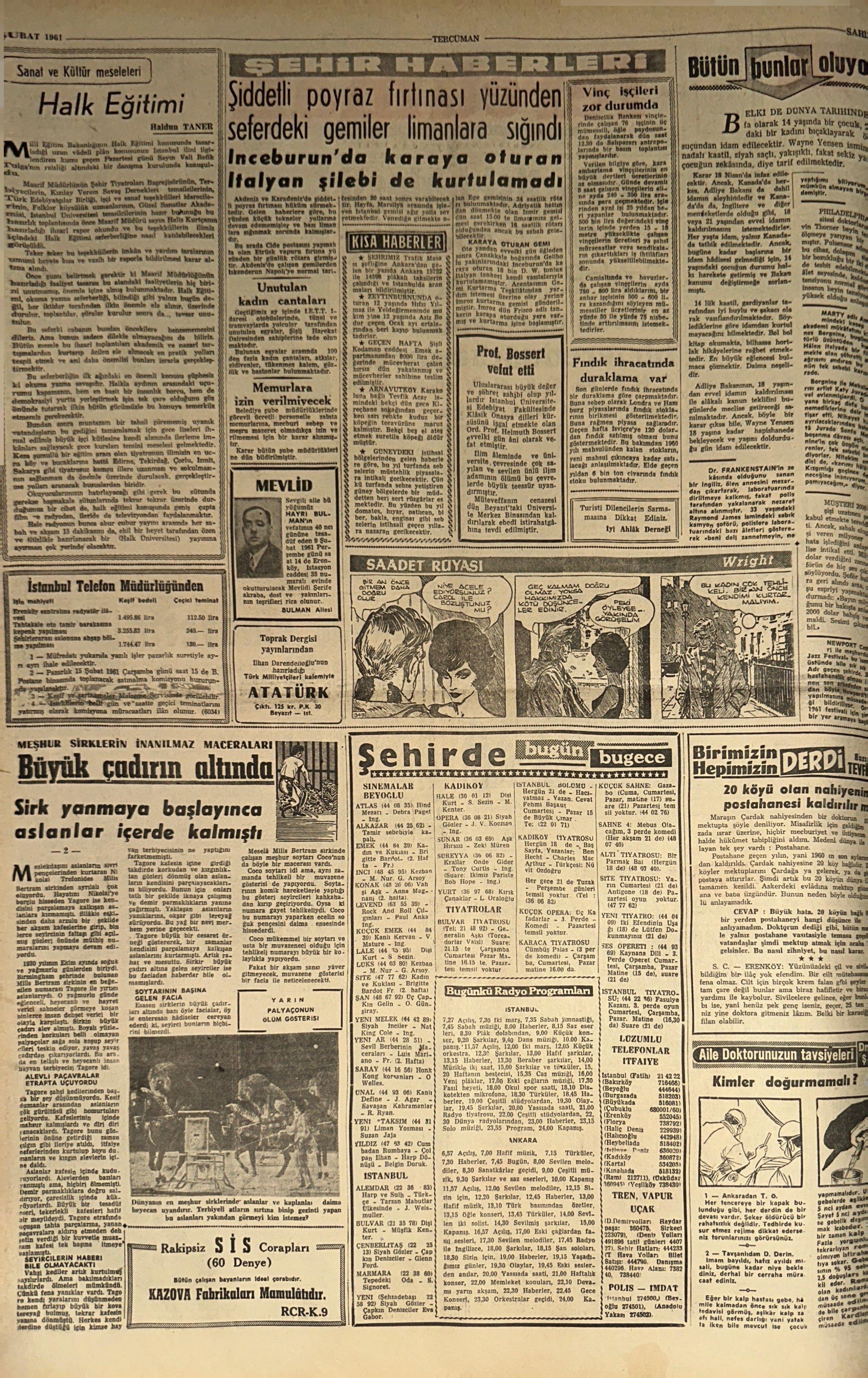 Haldun Taner 9 Şubat 1961’de Tercüman’daki köşe yazısında, Millî Eğitim Bakanlığı’nın halk eğitimi için hazırladığı uzun vadeli planı değerlendirmiş; okuma yazma seferberliğinden gece kurslarına, tiyatrodan filme uzanan bu çabanın pratik biçimde hayata geçirilmesi gerektiğini vurgulamıştı.