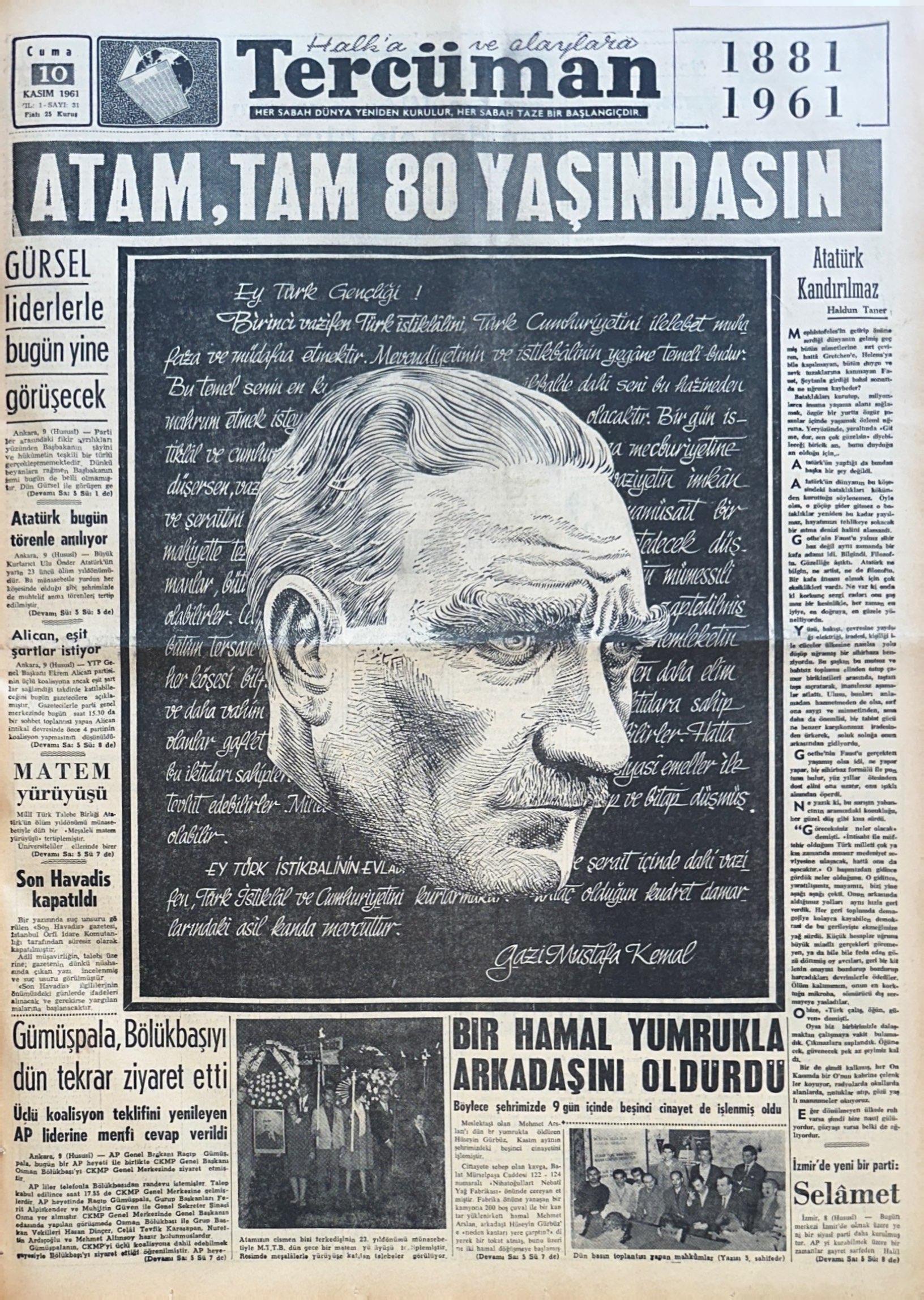 10 Kasım 1961 sabahı, Türkiye Cumhuriyeti tarihinde özel bir yere sahip olan bu günde, Tercüman gazetesi okurlarına bir dönüm noktasını hatırlatıyor. Atatürk’ün eşsiz liderliği ve cumhuriyetin temellerini attığı günler hâlâ canlı; halkın yüreğinde onun ideallerine bağlılık ve yenilenen vazife bilinci dalga dalga yayılıyor. O gün sayfalarında sadece bir anma değil, aynı zamanda bu mirasın bugün için taşıdığı anlam ve sorumluluk da yer alıyor. Manşet “Atam, tam 80 yaşındasın” cümlesiyle yapılıyor Tercüman gazetesinde. Asla ölmeyecek bir mirası hatırlatmak için…
