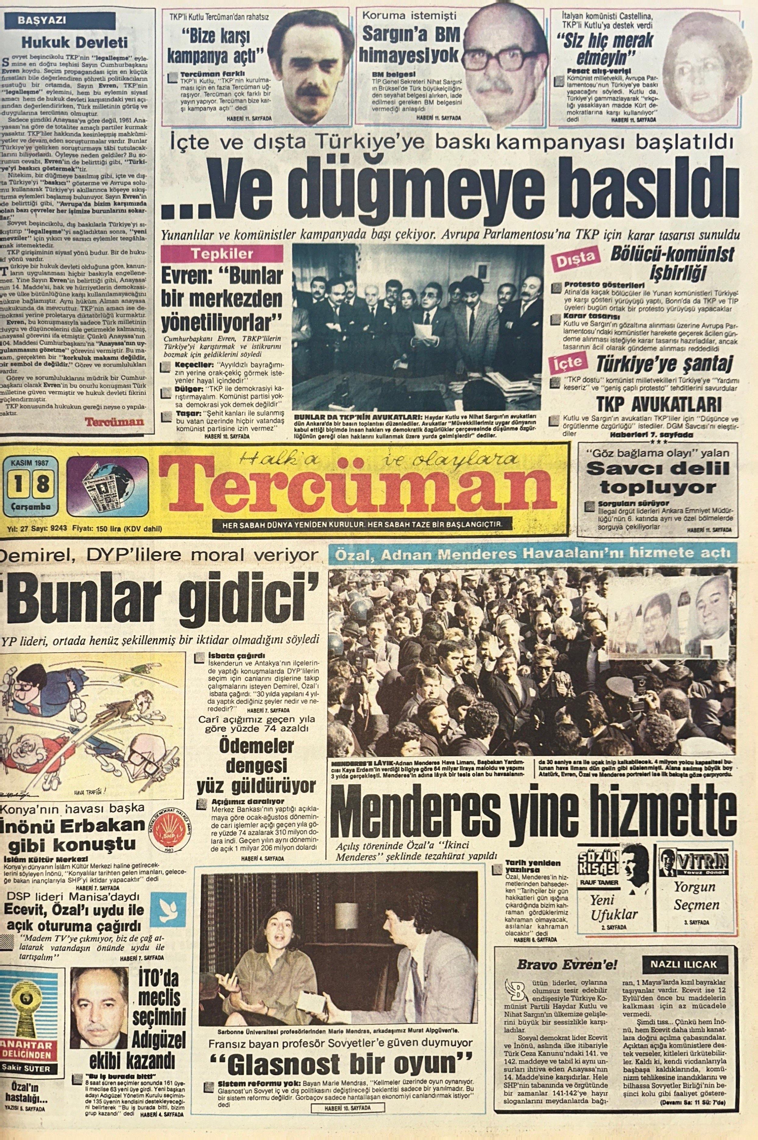 Tarih: 18 Kasım 1988. Tercüman gazetesinin manşeti o gün “İçte ve dışta Türkiye’ye baskı kampanyası başlatıldı… Ve düğmeye basıldı” cümlesiyle atılmıştı: “Yunanlılar ve komünistler kampanyada başı çekiyor. Avrupa Parlamentosu’na TKP için karar tasarısı sunuldu.”