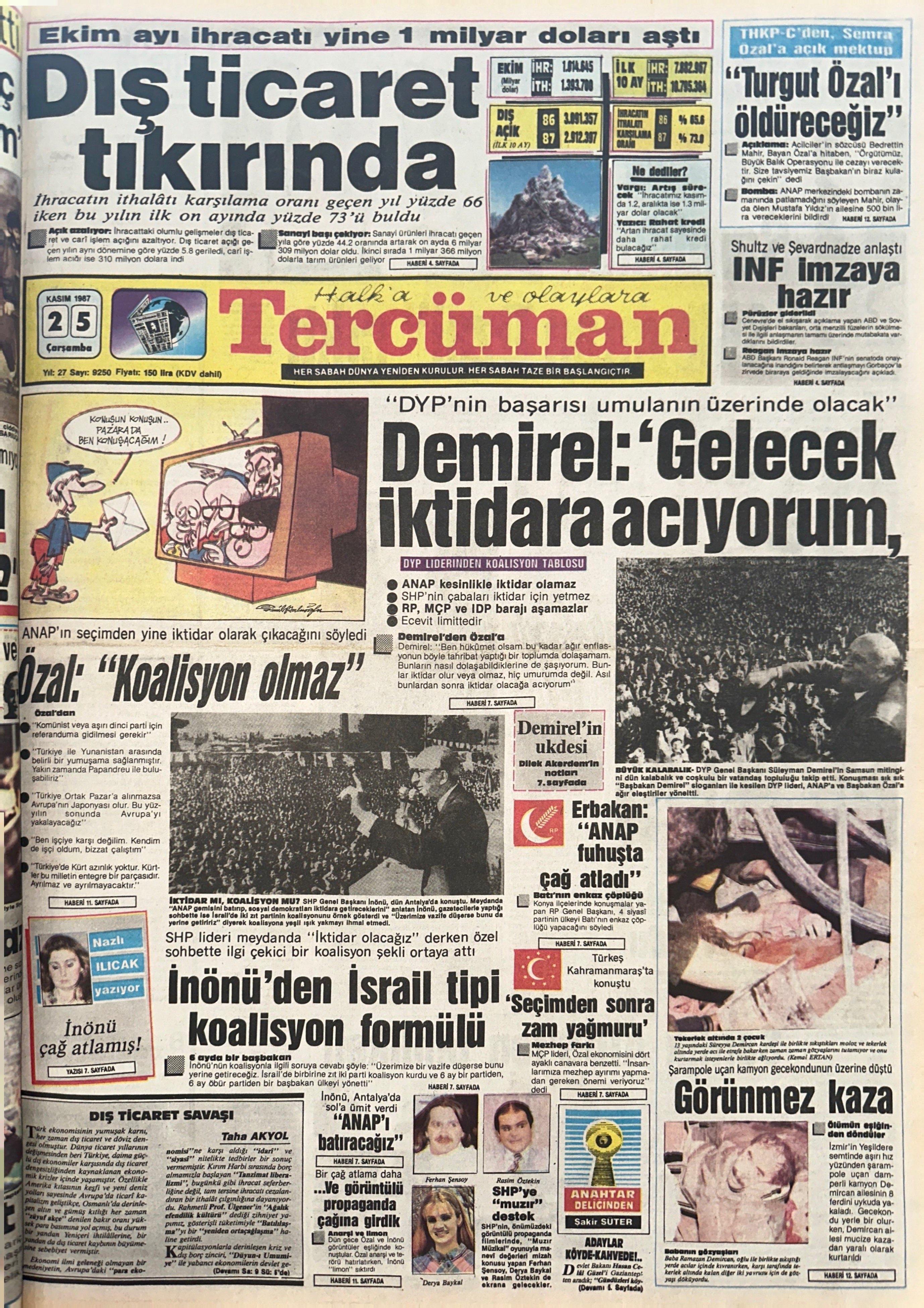 1987 Genel Seçim yaklaşırken siyasi arena elbette kızışmıştı. Tercüman’ın manşetinde de yer aldığı üzere ülke; Süleyman Demirel, Turgut Özal, Erdal İnönü ve Necmettin Erbakan’ın düellosuna şahit olmaktaydı. DYP lideri Süleyman Demirel, Özal’a hitaben “Ben hükûmet olsam bu kadar ağır enflasyonun böyle tahribat yaptığı bir toplumda dolaşamam. Bunlar iktidar olur veya olmaz, hiç umurumda değil. Asıl bundan sonra iktidar olacağa acıyorum” diyor; koalisyon olması ihtimali için de “ANAP kesinlikle iktidar olamaz, SHP’nin çabaları iktidar için yetmez; RP, MÇP ve IDP barajı aşamazlar, Ecevit limittedir” söylemlerinde bulunuyordu. ANAP lideri Turgut Özal ise seçimden yine iktidar olarak çıkacağını belirtiyor, şunları söylüyordu: “Komünist veya aşırı dinci parti için referanduma gidilmesi gerekir”, “Türkiye ile Yunanistan arasında belirli bir yumuşama sağlanmıştır. Yakın zamanda Papandreu ile buluşabiliriz”, “Türkiye Ortak Pazar’a alınmazsa Avrupa’nın Japonya’sı olur. Bu yüzyılın sonunda Avrupa’yı yakalayacağız”, “Ben işçiye karşı değilim. Kendim de işçi oldum, bizzat çalıştım”, “Türkiye’de Kürt azınlık yoktur. Kürtler bu milletin entegre bir parçasıdır. Ayrılmaz ve ayrılmayacaktır.”