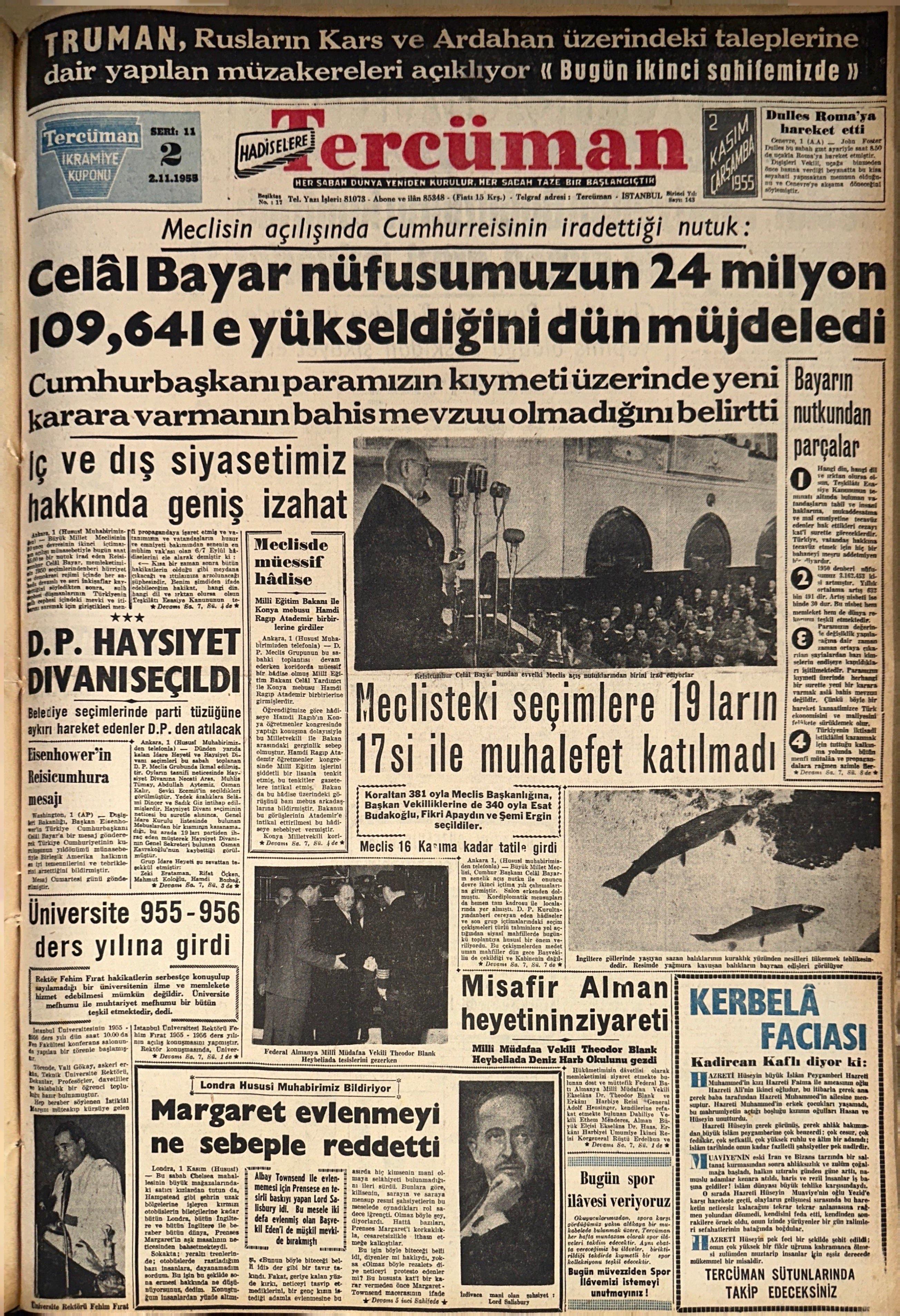 Tarih 2 Kasım 1955. Önceki gün Cumhurbaşkanı Celal Bayar, meclis açılışında ülkenin güncel nüfusunu müjdelemişti: 24.109.461. Gelin o güne Tercüman'ın tanıklığıyla birlikte bakalım.