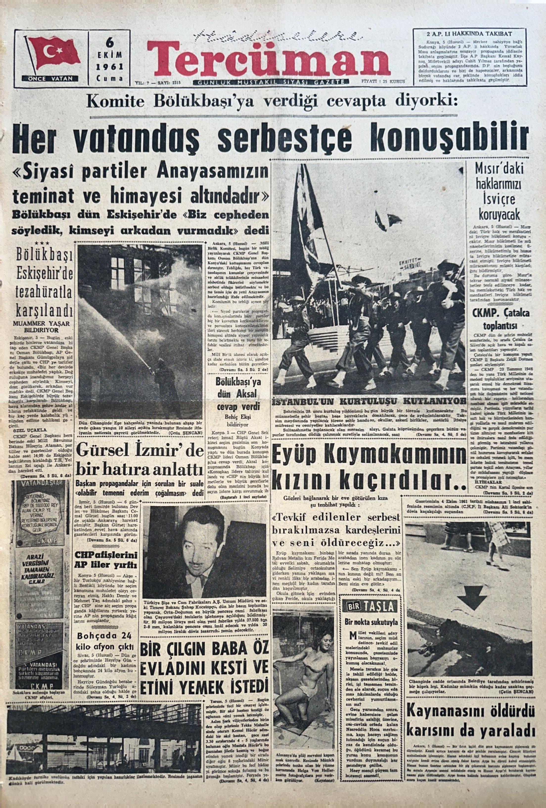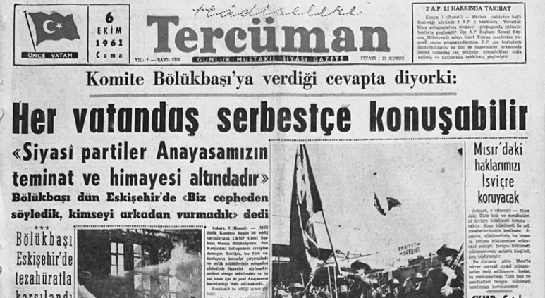 Tarih, 6 Ekim 1961. Tercüman o günün manşetini “Komite Bölükbaşı’ya verdiği cevapta diyor ki: Her vatandaş serbestçe konuşabilir. Siyasi partiler Anayasamızın teminat ve himayesi altındadır” şeklinde atmıştı. Haber şöyle devam ediyordu: “Millî Birlik Komitesi, bugün bir tebliğ yayınlayarak CKMP Genel Başkanı Osman Bölükbaşı’nın dün Konya’daki konuşmasını cevaplandırmıştır. Tebliğde her Türk vatandaşının kanunlar çerçevesinde ve ahlak telakkilerinin müsaadesi nisbetinde fikirlerini söylemekte serbest olduğu bildirilmekte ve bunu temin için de yeni Anayasa’nın hazırlandığı ifade edilmektedir. Komitenin bu tebliği aynen şöyledir: Siyasi partilerin propaganda konuşmalarında bazı partiler hiçbir kuvvetten korkmadıklarını ve pervasızca konuşabileceklerini ileri sürerek herhangi bir merciin himayesi altında siyaset yapmadıklarını belirtmekte ve bunu bir tefahür vesilesi ittihaz etmektedirler…” İleri sayfalarda bu tebliğin tamamı aynen aktarılmıştı.