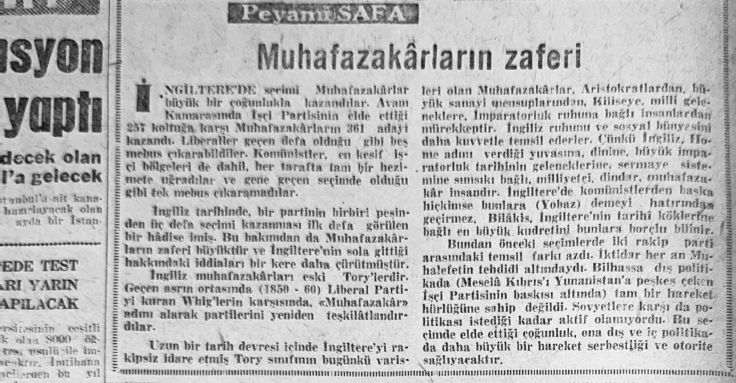 Peyami Safa, 11 Ekim 1959’da Tercüman’daki köşe yazısında o günlerde gerçekleşen İngiltere’deki seçimler hakkında değerlendirmelerde bulunmuş; İşçi Partisi ile muhafazakârların arasındaki çekişmeleri Kıbrıs meselesi üzerinden açıklamıştı.