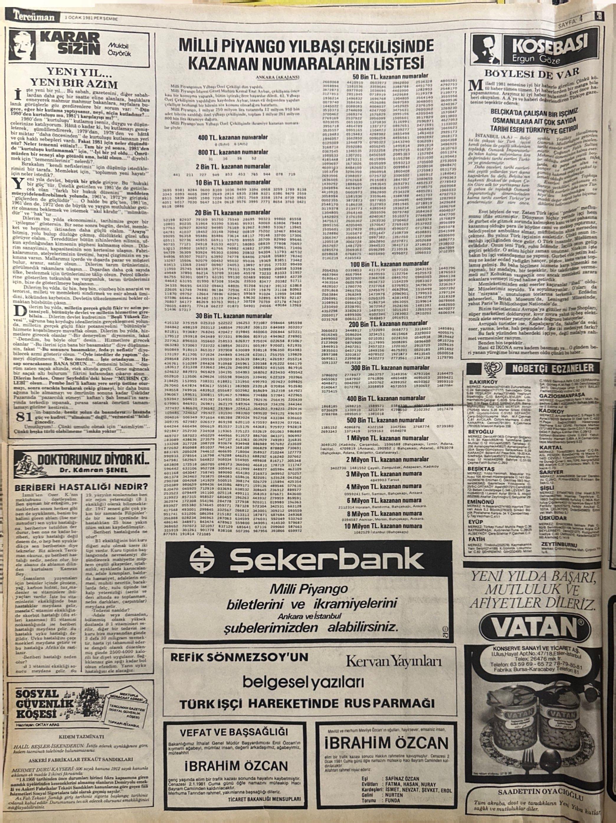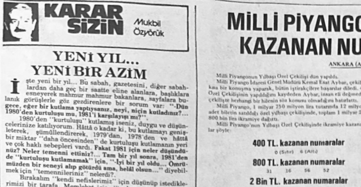 İşte yeni bir yıl… Bu sabah, gazetesini diğer sabahlardan daha geç bir saatte eline alanlara, başlıklara esneyerek mahmur mahmur bakanlara, sayfalara bulanık görüşlerle göz gezdirenlere bir sorum var: “Dün gece, eğer bir kutlama yaptıysanız, neyi, niçin kutladınız? 1980’den kurtuluşu mu, 1981’i karşılayışı mı?”