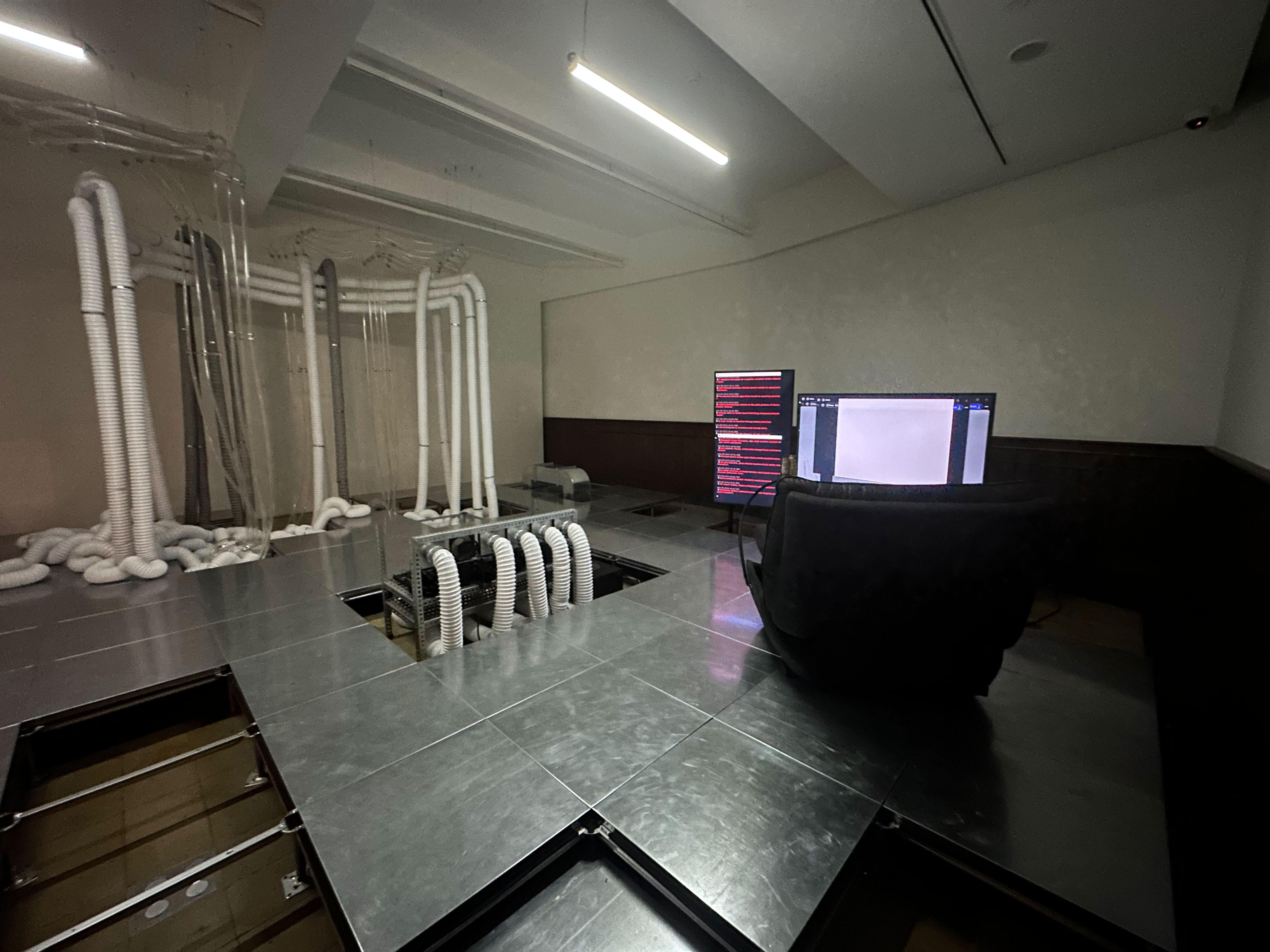 Buradan çıkıp yan sınıftaki yerleştirmeyi izlemeye gittiğimizde insanın yapısal özelliklerinin farklı bir boyutta, farklı bir bakış açısıyla sergilendiğini görüyoruz. İstanbullu sanatçı Merve Mepa “Rastgele Bir Yürüyüş, Beslenme ve Hava” (2025) adını verdiği bu yerleştirmesiyle insanın bedensel doğasını dijital platform üzerinden anlatıyor; bilgisayar kasası, borular, karıncalı ekran ve koltuk ile insanın sinir sistemini, veri akışı ve altyapı ağları gibi sunucu tabanlı bir ekosistem olarak aktarıyor.