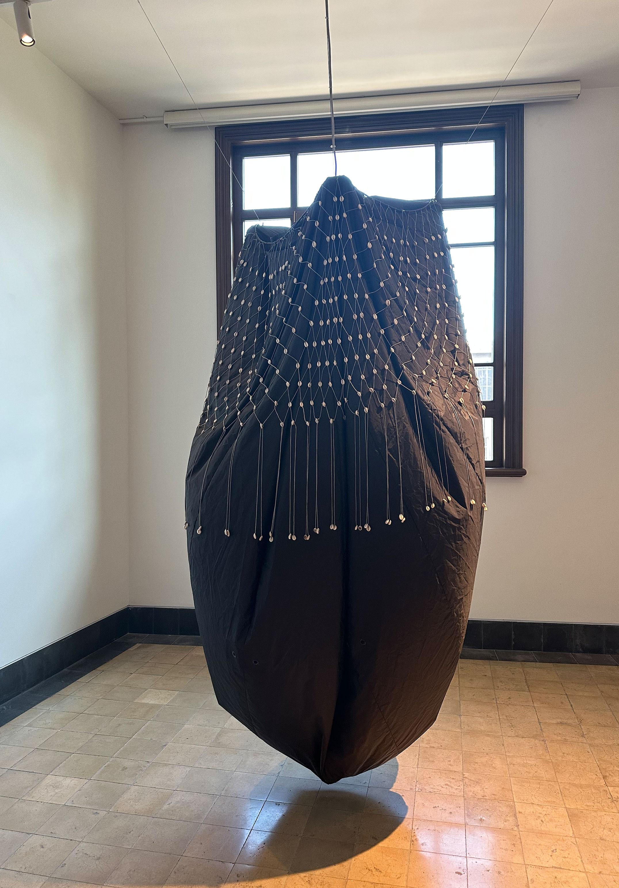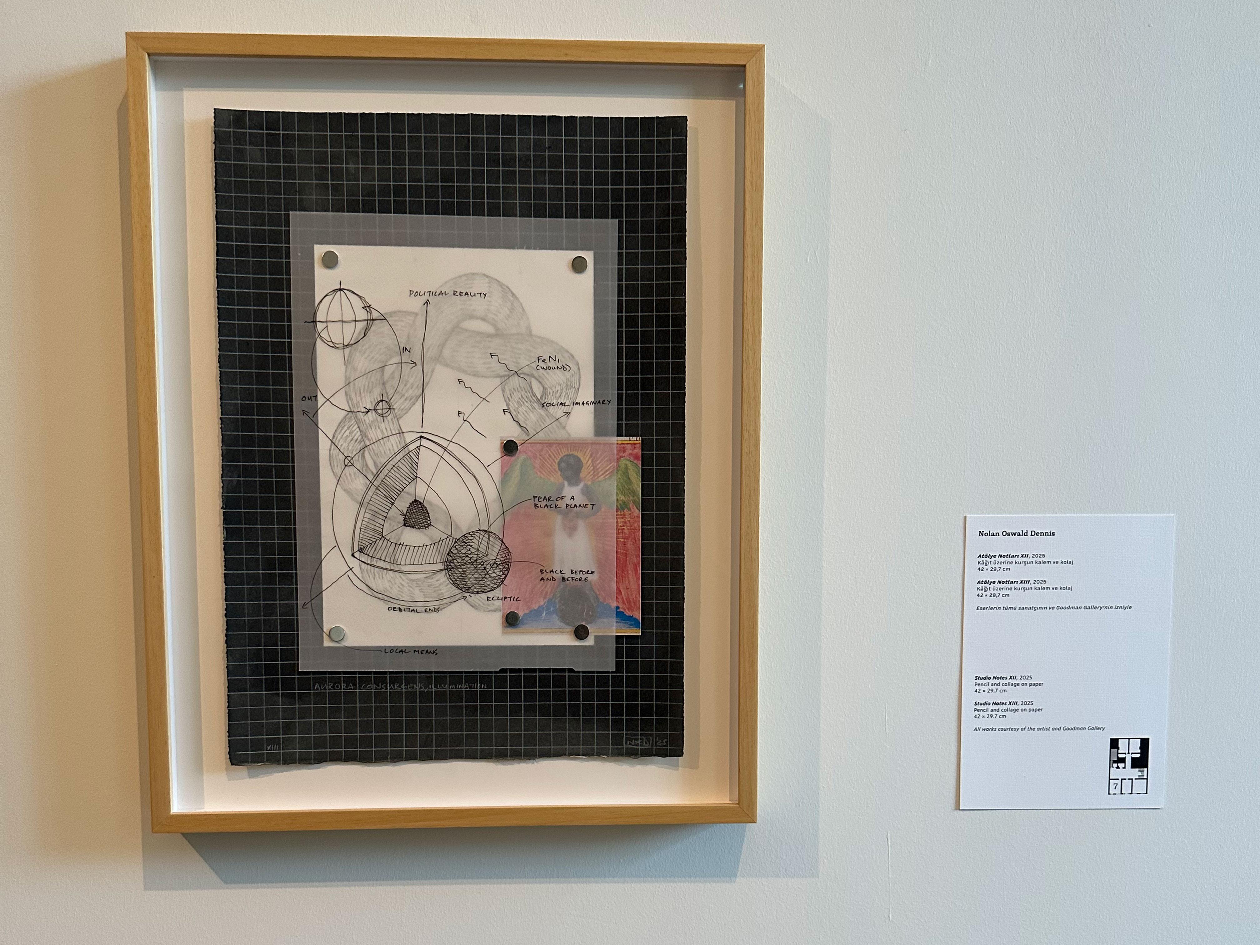 Ve ardından birçok dünyaya ait eskizler bizi karşılıyor, bilmediğimiz gezegenler, dünyalar… Nolan Oswald Dennis’e ait “seçenekler” (“options”/2019-) adlı bu eskizler, bir dizi kâğıt üzerine kurşun kalemle resmedilmiş dünya tasavvurlarıyla dolu. “seçenek” ve “Atölye Notları” ile sunduğu çizimlerin yanı sıra bu farklı dünyaların süreçlerinin de bulunduğu bir duvar çizimi de bulunuyor Nolan Oswald Dennis’in yerleştirmesinde. Duvardaki çizimde şu cümle yazıyor: “Dilediğimiz dünya, birçok dünyayı içinde barındıran bir dünya.” Bu temel düşünce, N. Oswald Dennis’in bir diğer eseri “kesilen nefes modeli (örtülü)”nde (“model for a gasp (veiled)”/2022) de hâkim. Kinetik bir heykel çalışması olan bu eser, siyah bir küre formunda ve deniz kabuklarından oluşan perdeyle üzeri örtülü. İzleyicinin hareketlerine göre şişiyor veya sönüyor, bu da onu bizle dönüşen dünya formuna sokuyor. Dünyanın alışık olduğumuz hâli ise gölgesiyle birlikte bir ikiz gösterim gibi “gölge modeli (açıklamalı)” (“model for a gasp (veiled)”/2022) ile sergileniyor.