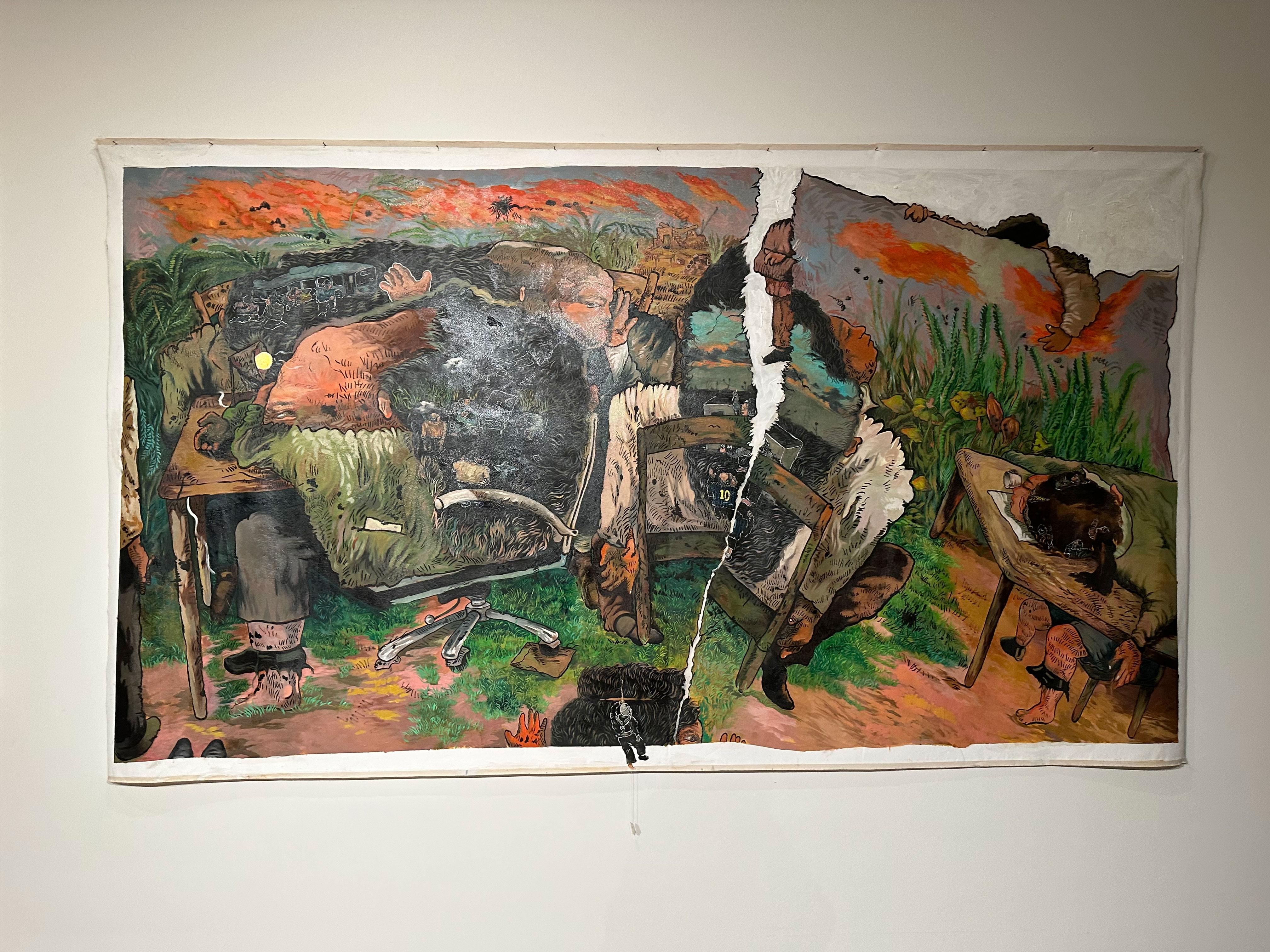 İkinci kata çıktığımızda da benzer bir travmanın iziyle karşılaşıyoruz. Ali Eyal; “13’e Geri Dönmelisiniz ve” (“You need to go back to page number 13 to not understand anything, and”/2023) adlı eseriyle yırtılmış, dezenformasyona uğramış bir tablo sunarak bu izi yansıtıyor bize. Eser, Bağdatlı sanatçının amcasının Irak’ın işgali sırasında Bağdat’ta yıkılan çiftliğinin yeniden tasarısını tasvir ediyor. Travmayı deformasyonla yansıtan sanatçı aynı zamanda “O Günden Beri Güvercinlerden Korkarım” (From then on, doves scare me”/2024) tablosuyla kişisel bir acısını da yapıtlaştırıyor; çocukluğunda yanlışlıkla öldürdüğü bir anısını otoportre olarak işliyor. Bu iki tablo da kişisel ve toplumsal hafızada yer alan acıya ve onu iyileştirmeye, yeniden hayat inşa etmeye dair umudu taşıyor.