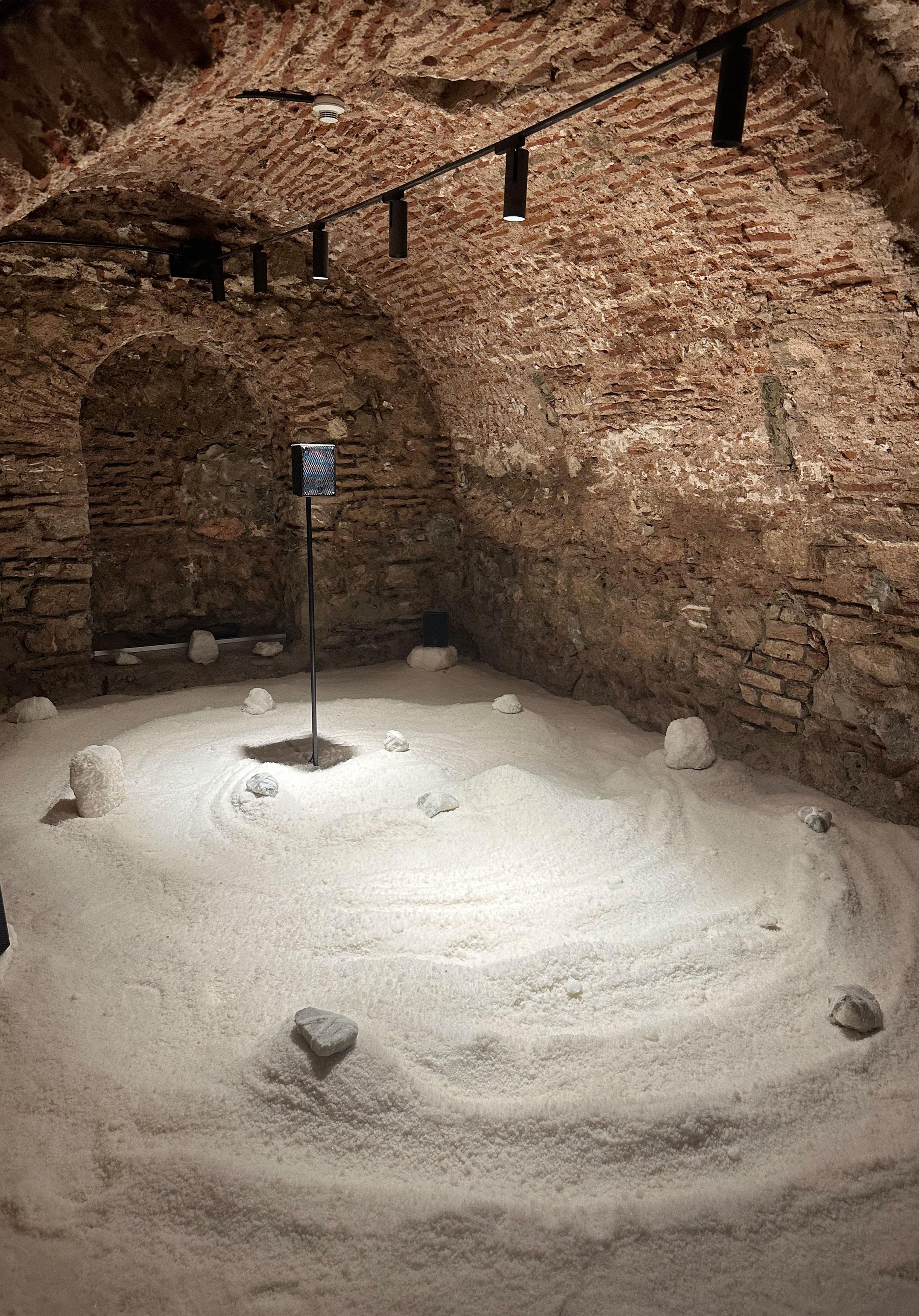 Galata Rum Okulu’nun tarihî dokusunu derinden hissettiğimiz ilk yer, girişte bulunan asma kat olsa gerek. Eski taş kemerlerin altında gözlerimiz bembeyaz parıldayan tuz kumullarıyla kamaşıyor burada. Ayman Zedani’nin “Çöl Denizleri Arasında” (“Between Desert Seas”/2021) adlı yerleştirmesi; Tuz Gölü’nden ve Nevşehir’in tuz ocaklarından üretilip buraya getirtilen tuz tanecikleri hem bu tarihî dokunun bir köşesinde hem de ayaklarımızın hemen altında sere serpe yatıyor. 1984 doğumlu Riyadlı sanatçı Ayman Zedani’yi tuz kumullarıyla çalışmaya iten “Sonsuz denize baktı ve ‘Keşke tüm balıkların övgülerini anlayabilseydim’ diye düşündü” cümlesi oluyor ve Yunus Peygamber’in mücadelesine referansta bulunuyor. Yunus Peygamber’in yolculuğu ve kambur balinaların rotaları arasında bir paralellik kurarak hem bu tarihî anlatıyı hatırlatıyor hem de bugüne ait ekolojik krizlere de dikkat çekiyor. Zira yerleştirmede kullanılan dokuz kanallı ses yerleştirmesi; 70 bin yılı aşkın bir süredir göç etmeyen, Arap Denizi’nde görece izole olarak hayatlarını sürdüren ve nesli tükenmekte olan kambur balinaların iletişim dilleri, şarkıları, geliştirmiş oldukları yaşam biçimlerine vurguda bulunuyor.