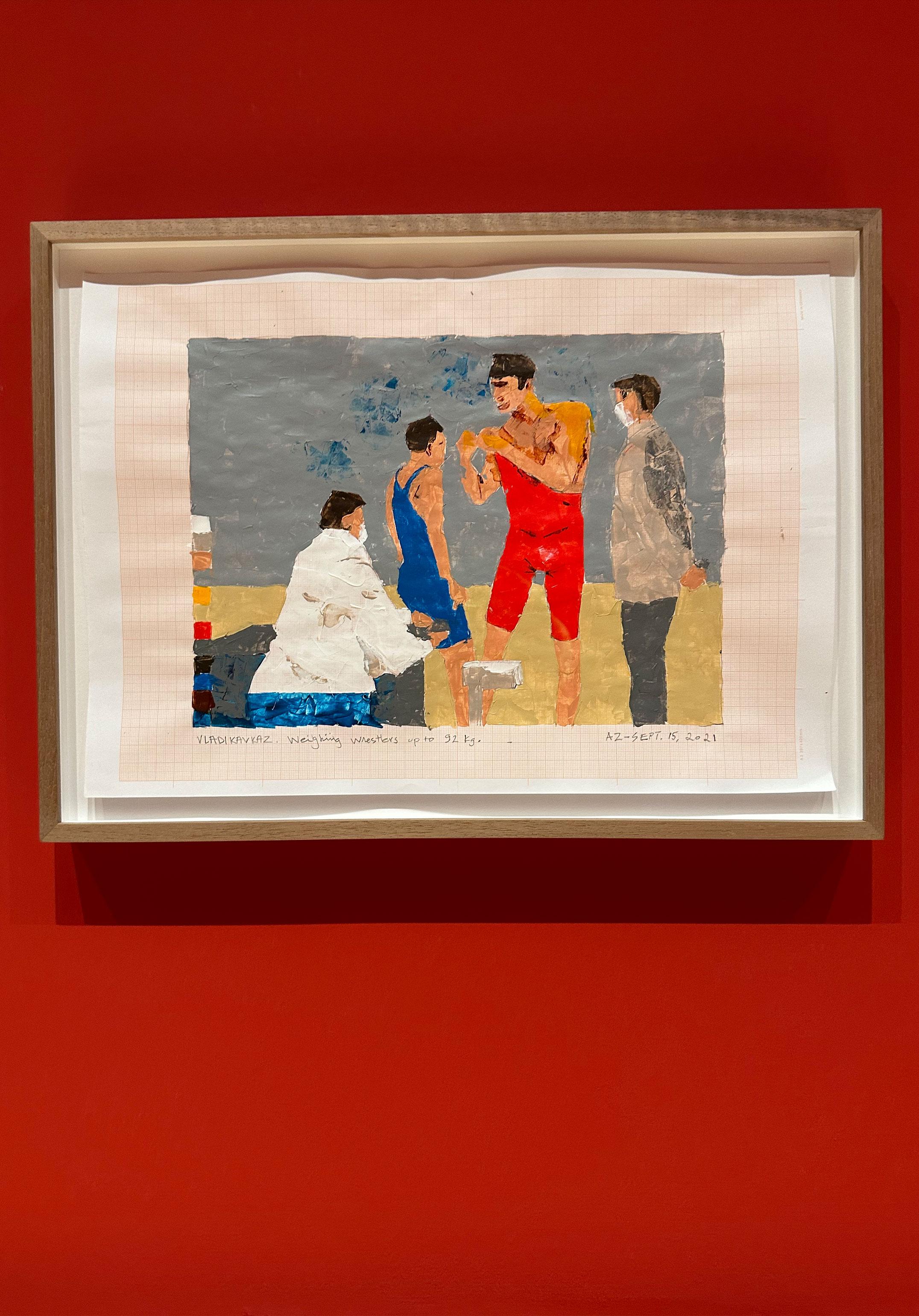 Geçmişin izleri; geleneksel ritüellerde, şarkılarda, müsabakalarda gizli. Bienalde karşılıklı iki oda boyunca bir tablo serisi sıralanıyor. Beyrutlu sanatçı Akram Zaatari’ye ait bu tablolar iki ayrı seride buluşuyor. Türkiye, İran ve Balkanlar’da geçmişten bugüne hâlen devam eden yağlı güreş karşılaşmalarının temsillerini sunan “Zeytin Yeşili” (“Olive Green”/2020) adlı sekiz eserden oluşan tablo serisi, adına özgü renkle duvarlarda yerini alıyor. Karşı odada bulunan “Kıpkırmızı” (“Crimson Red”/2021) tablo serisi ise sıkletlerini belirlemek için tartıya çıkmış Rus sporcuları tasvir ediyor, “homososyal kültürün ritüellerine” odaklanıyor. 8 tablodan oluşan bu yerleştirme de yine “Zeytin Yeşili”nde olduğu gibi, ismine ithafen kıpkırmızı duvarlarda konumlandırılıyor.