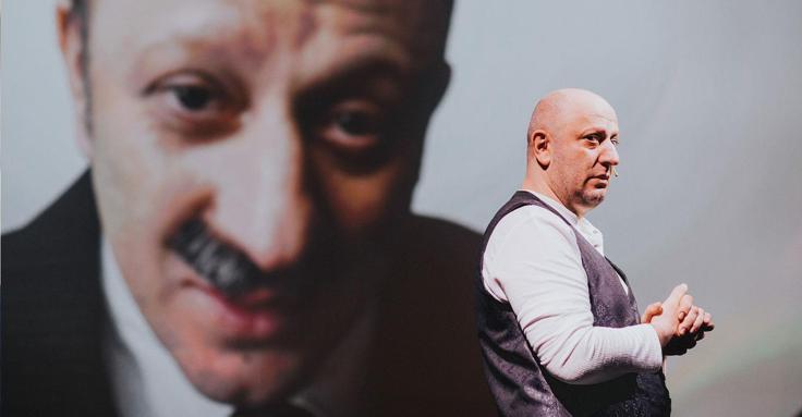 Dekor, oyuncunun hayal gücü için bir oyun alanı yaratıyor. Hiçbir şey göründüğü gibi değil. Basit bir masa, enstitünün görkemli (!) çalışma masasına, sandalyeler ise bir anda tramvaya dönüşebiliyor. Işık ve ses tasarımı da bu dönüşümü destekleyerek, mekân ve zaman geçişlerini ustalıkla sağlıyor. Bu sayede, devasa bir kadro ve karmaşık bir dekora ihtiyaç duymadan, koskoca bir romanın dünyası tek bir sahnede, bir avuç nesneyle yeniden yaratılıyor. Ama bunda en büyük etken dönen mekanizma üzerinde bulunan ekran. Biz Hayri İrdal’ın anlatılarında geçmişe ya da o ana girmeden önce aktarımlarını önce ekranda görüyoruz. Teknolojik bir entegrasyonla her karakter Serkan Keskin’in oyunculuğuyla önceden canlandırılmış, montajlanmış (tıpkı Leyle ile Mecnun dizisindeki İsmail Abi’nin akrabaları gibi). Oradaki anlatı, kesildiğinde paravanda ya da tuvalet masasında bir iki kostüm dokunuşuyla sahnede devam ediyor. Bu her ne kadar teknolojiden yardım alınarak yapılsa da kesintisiz bir merakla izleyiciyi sahneye kilitleyen, Serkan Keskin’in bizzat kendisi oluyor.