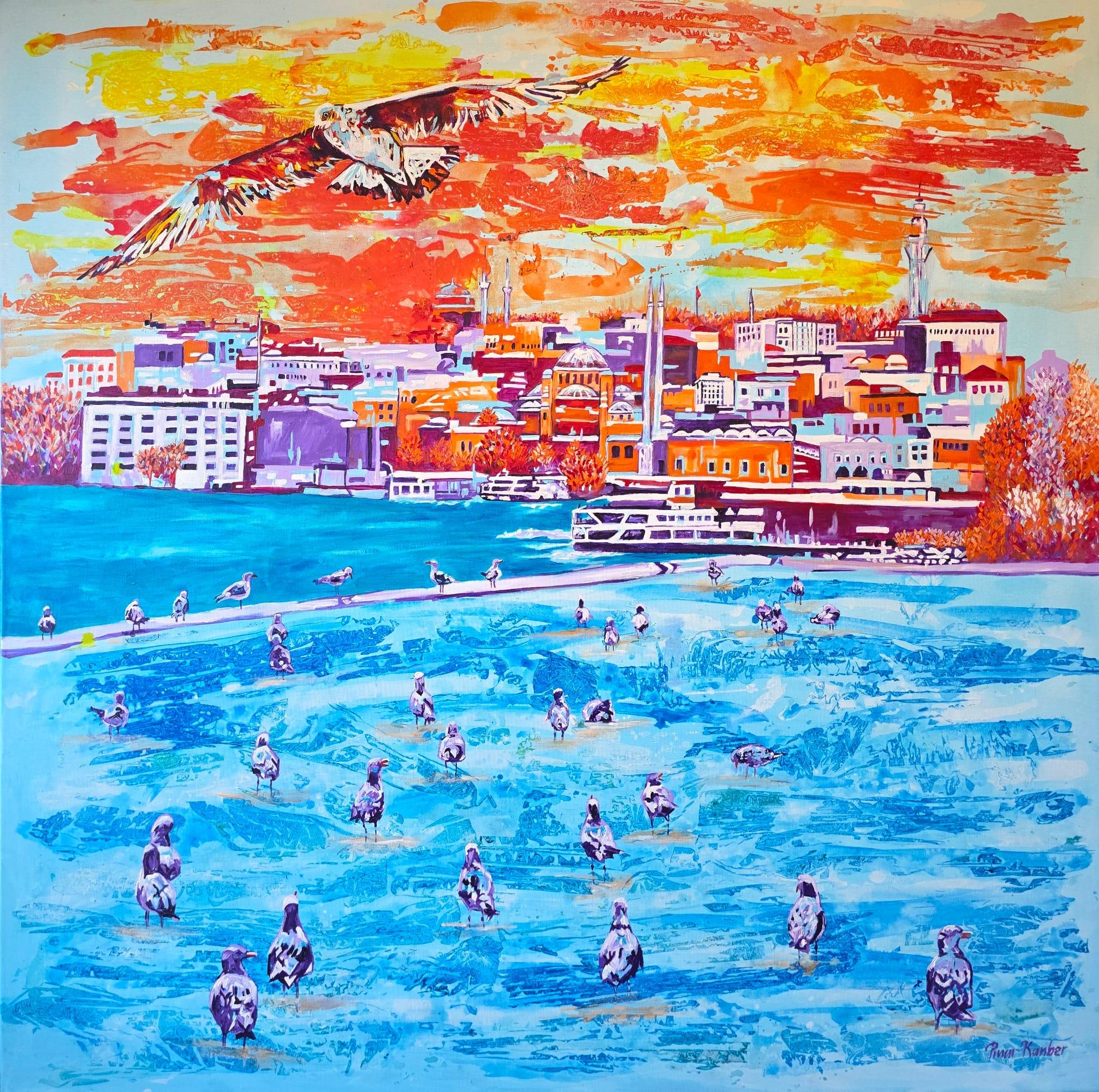 Bu şehirdeki üst üste binmiş zamanların, seslerin ve suskunlukların izini süren martılar, İstanbul’un gökyüzündeki en eski tanıklarıdır. Onlar; Bizans’ın yankılarına, Osmanlı’nın ihtişamlı mimarisine, Boğaz’ın akışına, limandan uğurlanan gemilerin taşıdığı vedalara ve kıyılarda fısıldaşan âşıklara şahittirler. Hatta Yahya Kemal Beyatlı ve Orhan Veli Kanık gibi şairlerin, şehrin sokaklarında yankılanan dizelerini hafızalarında taşırlar. İstanbul’a martıların gözüyle bakarak resimlerimi üretmek, bu süreçte bana büyük bir heyecan veriyor.