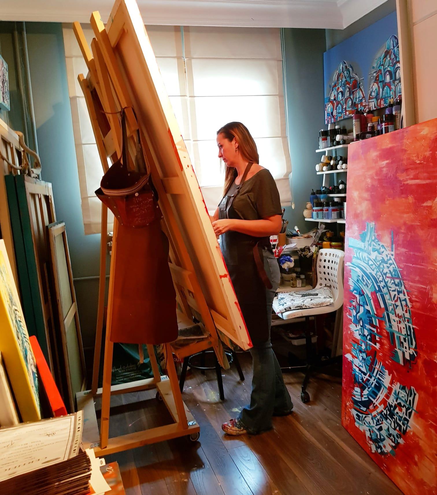 İstanbul ve Çanakkale olmak üzere iki şehir arasında yaşıyorum. Araştırmalarımı ve İstanbul’daki fotoğraflama sürecini tamamladıktan sonra, Çanakkale’deki atölyemde üretim sürecine başladım. Çanakkale’de yaşam daha yavaş akar; dingin ve huzurludur. Büyükşehir olan İstanbul’dan uzakta olmak elbette farklı bakış açıları kazandırdı, ancak biz ressamlar yüreğimize dokunanı resmederiz. Boş tuvalin karşısına geçtiğimizde saatlerce ara vermeden çalışabiliriz; üretim süresince zaman ve mekân kavramını yitiririz. Fırçamızın ucuyla bir martının kanadına tutunup İstanbul’a gidebilir, hatta geçmiş zamanlarda dolaşabiliriz.