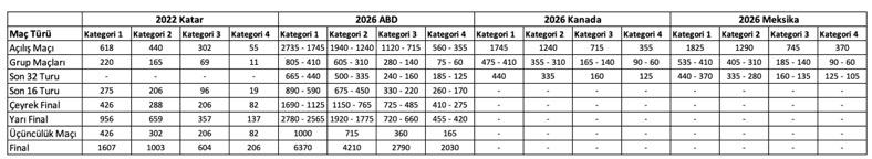 Neredeyse tüm futbol paydaşlarının ön yargıyla yaklaştığı Katar’daki Dünya Kupası ile ABD’deki Dünya Kupası arasındaki fiyat farkı anlaşılabilir olsa da biletlerinin önceki turnuvaya kıyasla çok daha pahalı olduğu açık. Galerideki tablodan Katar, ABD, Kanada ve Meksika’daki bilet fiyatları karşılaştırılabilir. İki fiyatın belirtildiği gruplarda minimum ve maksimum değerler verilmiştir.